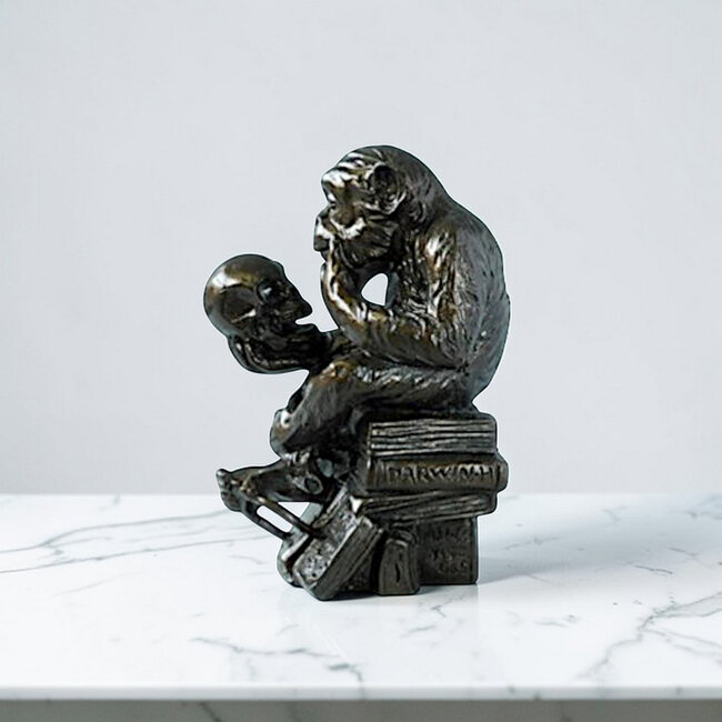 Het beeld toont een aap die aandachtig een menselijke schedel bestudeert, zittend op een stapel boeken met de naam van Charles Darwin. Hiermee verwijst Rheinhold naar de evolutietheorie en de relatie tussen mens en dier. Door de rollen om te draaien - de aap die de mens onderzoekt - nodigt het beeld uit tot reflectie over bewustzijn, kennis en de oorsprong van de mens.