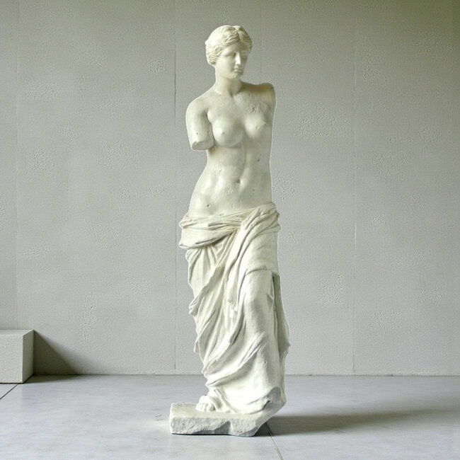 Het bekende beeld van Aphrodite geldt als symbool van de eeuwige schoonheid. We kennen het als de Venus van Milo, of de Aphrodite van Melos, verwijzend naar het Griekse eiland waar het in 1820 is gevonden. Aphrodite, door de Romeinen later Venus genoemd, was de godin van de liefde en van de schoonheid, geboren uit het zilveren schuim (aphros) van de zee. De stijl van de Venus van Milo vertoont zowel hellenistische als klassieke kenmerken. Haar bovenlijf is veel klassieker dan het onderste deel van het beeld. Het beeld is vervaardigd uit zeven blokken marmer. De godin staat in de kenmerkende contrapunthouding: volledig op één been, waardoor haar lichaam een uitdagende curve krijgt. We kunnen ons nu amper meer voorstellen hoe het beeld er oorspronkelijk heeft uitgezien. Het was uitbundig gekleurd, en voorzien van sierraden en juwelen. Waarschijnlijk hield Aphrodite in haar linkerhand de appel, die ze van Paris van Troje had gekregen.