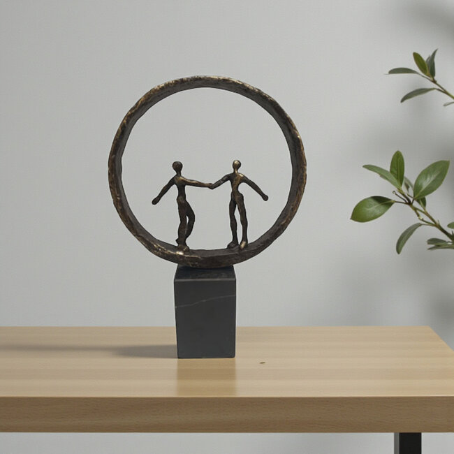 Dit indrukwekkende beeld van kunstenaar Ger van Tankeren toont twee personen die elkaar de hand schudden te midden van een cirkel, symbool voor verbinding, vertrouwen en afronding. Het kunstwerk, getiteld De Zaak is Rond, straalt warmte en harmonie uit en vangt het bijzondere moment van samenwerking en overeenstemming.