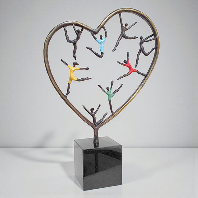 Dit prachtige verbronsde kunstbeeld in kleur van Corry Ammerlaan toont een hartvorm waarin kinderen zich speels bewegen. Het beeld symboliseert liefde, geborgenheid en het geven van kansen aan kinderen: een warm eerbetoon dat emotie en betekenis samenbrengt. De speelse kinderen in het hart brengen vrolijkheid en energie in elke ruimte, terwijl het verbronsde materiaal zorgt voor een tijdloze, elegante uitstraling.