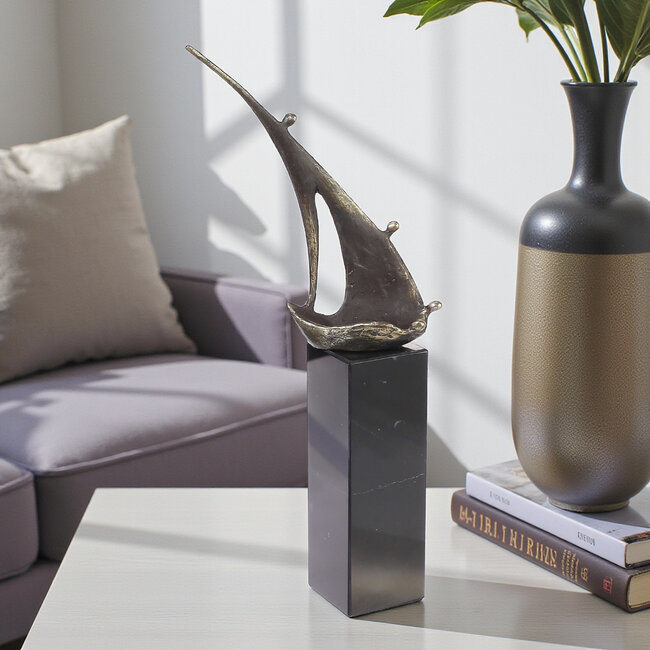 Global sculptuur. Op Marmeren beeld. Tin legering en daarna verbronsd, zware kwaliteit. Hoogte 24 cm Lees meer.