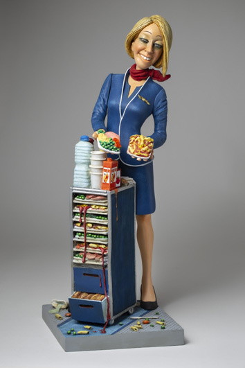 Net toen de stewardess het diner wilde serveren, begon het vliegtuig kleine schokken te ervaren, die steeds heftiger werden. De voedselkarren werden snel opgeborgen en de turbulentie werd erger. Losse voorwerpen vlogen door de lucht. Domenico voelde zijn maag draaien, een trilling ging door zijn lichaam en hij dacht dat hij zou flauwvallen. Tien minuten later werd de rust hersteld en stabiliseerde de vlucht. De stewardess kwam terug met haar kar en, terwijl ze een dienblad in elke hand oppakte, vroeg ze met een vriendelijke glimlach: “Kip of pasta...?”. “Een spuugzakje alstublieft!” antwoordde Domenico.. De Komische Kunst van Guillermo Forchino is nu verkrijgbaar voor een grotere groep kunstliefhebbers in gelimiteerde en genummerde uitgaven.
