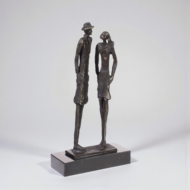In overleg sculptuur. Dit beeld staat op een marmeren sokkel. Sculptuur van tin legering en daarna verbronsd. Hoogte 20 cm Lees meer.
