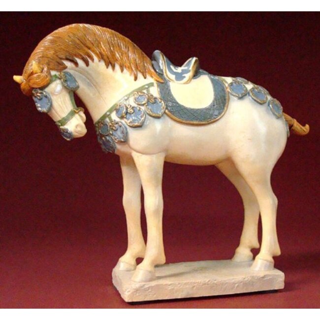 Tijdens de Tang dynastie bereikte de Chinese keramische traditie een artistiek hoogtepunt. Op basis van het bruin en groen geglazuurde aardewerk uit de Han dynastie ontstond het befaamde driekleurige aardewerk. Hoogwaardig kunsthars beeld van 17 cm hoog. Lees meer.