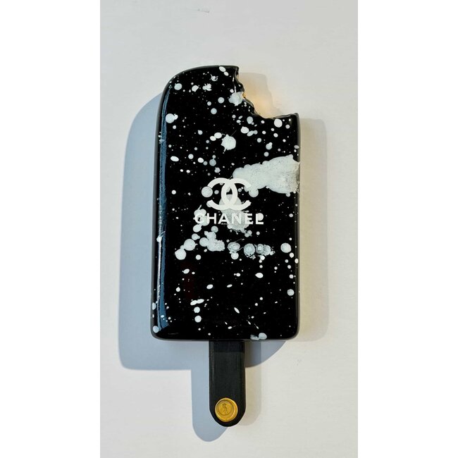 Deze kunstenaar creëert werken geïnspireerd door Pop Art. Zijn glinsterende ijsjes gemaakt van resin, handgeschilderd met logo’s van luxe merken. Ijsjes zijn 21 cm hoog, gesigneerd aan de achterzijde. Achterkant voorzien van gat om zo op te hangen.