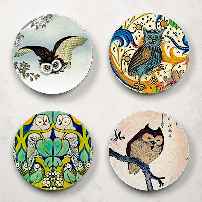 Deze unieke set van vier onderzetters toont uilen uit historische kunstwerken, elk afkomstig uit een andere cultuur en kunststroming. De uil is wereldwijd een krachtig symbool en staat voor wijsheid, bescherming en inzicht. Deze onderzetters combineren kunst, geschiedenis en betekenis in een stijlvol en functioneel object.
